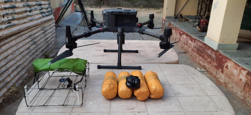 A small green-coloured bag was attached to the drone. It contained four packets in yellow wrapping and one small packet in black coloured wrapping containing contraband items weighing approximately 4.17 kgs (with packing material) and approximately 250 gm of items packed in the black wrapper.