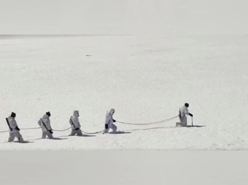It is clearly visible in the video that the depth of the snow is up to the knees of the soldiers, due to which the soldiers are facing difficulty in moving forward but they are seen moving forward without any interval.