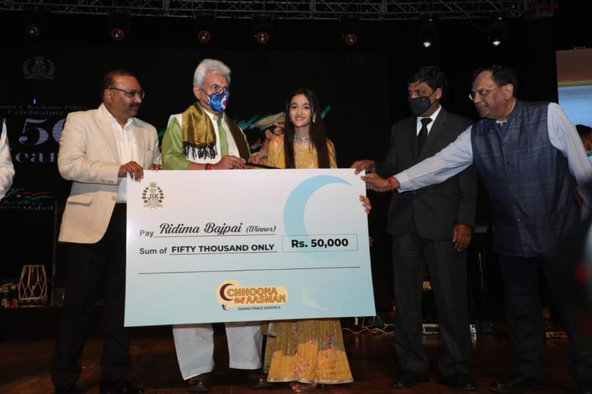 JAMMU: Lieutenant Governor-J&K U.T Manoj Sinha felicitated Ridhima Bajpai, student of Class X-A of Delhi Public School Jammu with cash prize of Rs. 50,000/- for winning grand finale of “Choona Hai Aasman Season-6”, a musical talent hunt programme organized by J&K Police under its civic action programme held at Gulshan Ground, Jammu.